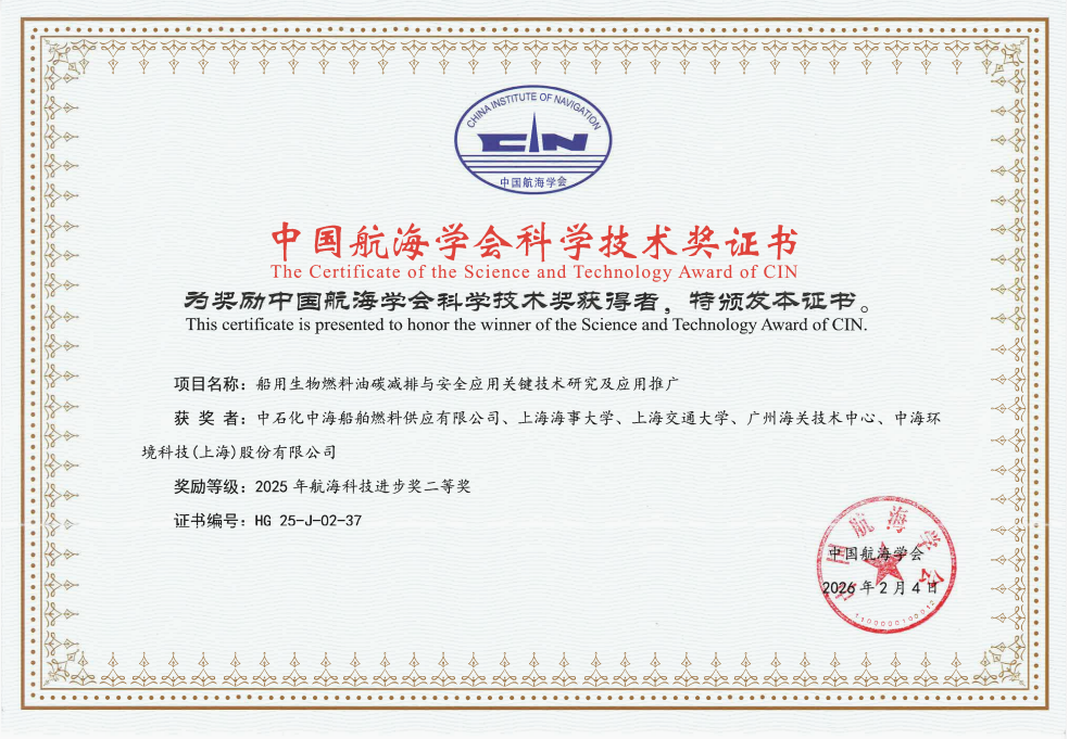 近日,2025年度中国航海学会科学技术奖评审结果正式公布,我司科研成果“船用生物燃料油碳减排与安全应用关键技术研究及应用推广”凭借突出的技术创新与应用价值,经行业权威专家严格的评价与评审,荣获2025年度航海科技进步奖二等奖。中国航海学会科学技术奖是经国家科学技术奖励工作办公室批准设立的全国性行业科技奖项,代表我国航海领域的最高科技水平。